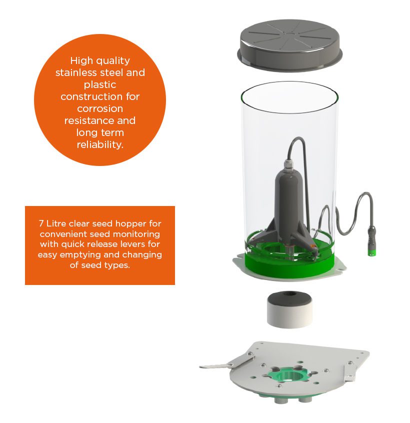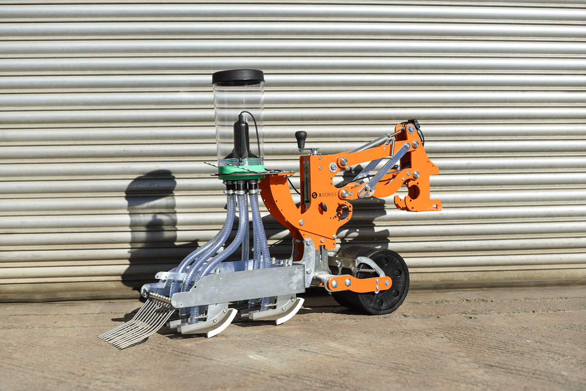 A modular high-density seed drill. It uses a sponge metering system to deliver accurate high rate application of a variety of small seed types alongside a chassis and coulter system to ensure even depth and seed coverage across the width of the bed for ultimate uniformity of the crop in a variety of ground conditions.
